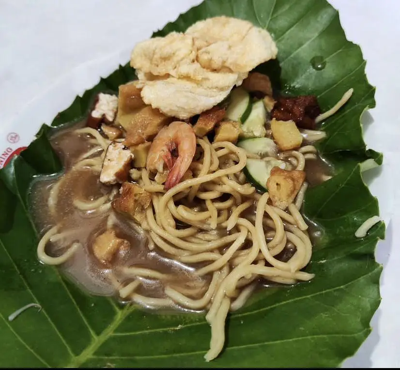 Mie Belitung: Mie kuning yang disiram kuah kental berwarna cokelat dari kaldu udang dan gula merah. Di dalamnya ada potongan tahu, kentang rebus, udang, dan emping renyah. Rasanya manis-gurih yang sangat unik.
