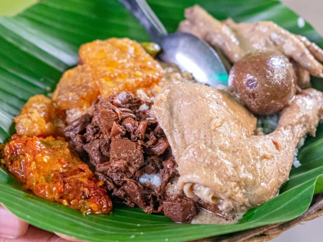Tahukah Anda? Warna cokelat gelap pada Gudeg Jogja yang otentik sama sekali tidak menggunakan kecap. Fakta menariknya, warna tersebut dihasilkan dari Daun Jati yang ikut direbus bersama nangka muda. Selain memberikan warna alami yang cantik, daun jati juga memberikan aroma tanah yang khas dan membuat gudeg tidak cepat basi meskipun tanpa bahan pengawet.