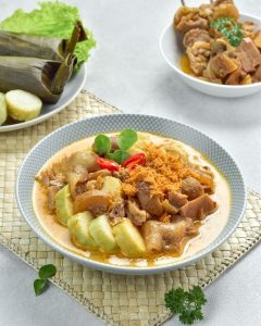 Menggunakan kuah santan kental dengan tambahan semur tahu.