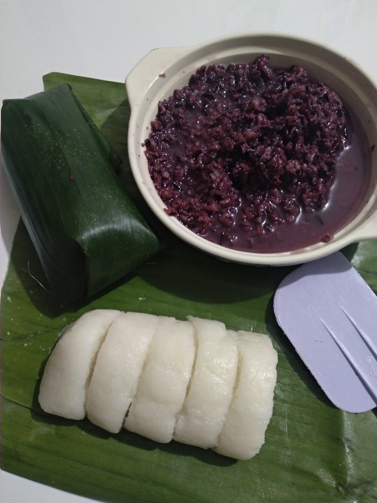 Beras ketan dimasak dengan santan dan sedikit garam, kemudian ditumbuk hingga padat dan kenyal.